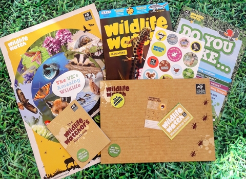 A welcome pack with an explorer handbook, pin badge, stickers and Wildlife Watch membership card