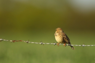 Three twite perch on a wire fence. They're in winter plumage, with bright yellow beaks